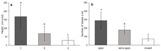 The young oak plants that grew in the closed canopy conditions differed from the plants that grew in the semi-open or open canopy conditions. The height of the plants (F = 63.308, p < 0.0001), as well as the number of leaves (F = 111.763, p < 0.0001), differed significantly between different canopy cover classes. The plants’ height, as well as the number of leaves, was highest in the open canopy cover class, lower in the semi-open, and lowest in the closed canopy cover class (Figure 3).