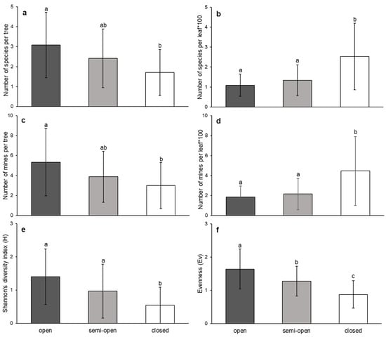 The influence of canopy cover class on the sessile oak leaf miner community (mean ± SD), represented by the number of species per tree (a), number of species per leaf × 100 (b), number of mines per tree (c), number of mines per leaf × 100 (d), Shannon’s diversity index (e), and evenness (f), assessed by the GLMM (letters above the columns indicate the grouping calculated by LSD post hoc test).