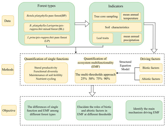This study investigated three forest types: Betula platyphylla pure forest (BP), B. platyphylla–Larix principis-rupprechtii mixed forest (BL), and L. principis-rupprechtii pure forest (LP). The primary objectives were the following: (1) to analyze the relationships between forest productivity, functional diversity, nutrient cycling, soil fertility maintenance, and variations in EMF across these forest types; (2) to elucidate the roles of biotic and abiotic factors in EMF at different thresholds; and (3) to identify the main mechanism driving EMF. The following three hypotheses were tested: Hypothesis H1. Mixed forests exhibit higher productivity than pure forest; Hypothesis H2. Biodiversity and soil factors jointly determine forest EMF; and Hypothesis H3. The primary mechanism driving EMF is niche complementarity.