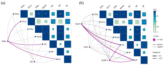 The influencing factors of single ecosystem function and the Pearson correlation coefficient matrix for each ecosystem function: (a) biotic factors and (b) abiotic factors. The thickness of the lines is proportional to the coefficient of determination in the linear regression model. Solid line represents positive effect, while dashed line represents negative effect. Purple line indicates significant effects, and gray line indicates insignificant effects. NC, nutrient cycling function; SF, soil fertility maintaining ability; SP, stand productivity; FEve, functional evenness; FRic, functional richness; FDis, functional dispersion; RaoQ, Rao’s quadratic entropy; Sdba, the standard deviation of basal area; SoilPC1, soil nutrient content; MAT, the average temperature during the growing season; MAP, the average precipitation during the growing season. *—p < 0.05, **—p < 0.01, ***—p < 0.001.