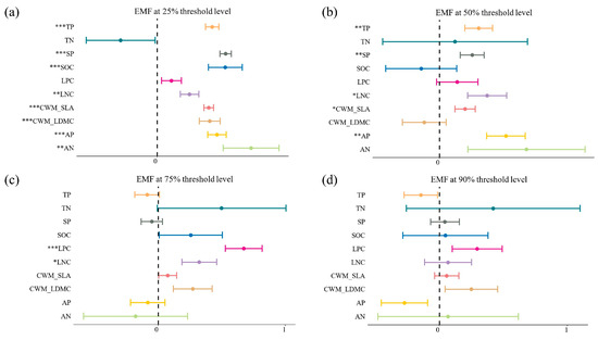 Standardized regression coefficient of the linear model. Panels (a–d) represent EMF at 25%, 50%, 75%, and 90% thresholds, respectively. EMF, ecosystem multifunctionality; SOC, the soil organic carbon; TN, total nitrogen; TP, total phosphorus; AN, available phosphorus; AP, available nitrogen; CWM, community weighted mean; SLA, specific leaf area; LDMC, leaf dry matter content; LNC, leaf nitrogen content; LPC, leaf phosphorus content; SP, stand productivity. Different colors represent different indicators. *—p < 0.05, **—p < 0.01, ***—p < 0.001.