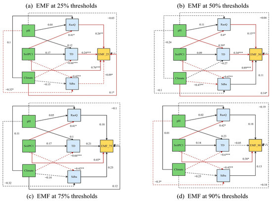 The direct and indirect influence of abiotic and biotic factors on EMF at different thresholds. Panels (a–d) represent EMF at 25%, 50%, 75%, and 90% thresholds (EMF_25, EMF_50, EMF_75, and EMF_90), respectively. All abbreviations are as explained in Figure 8.