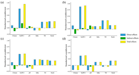 The structural equation model results illustrated that, at different thresholds (from 25% to 90%), the predictors accounted for 97%, 93%, 31%, and 29% of the variation in EMF, respectively (Figure 8). Soil nutrient content (SoilPC1) exhibited a notable direct positive correlation with EMF at the 25%, 50%, and 75% thresholds (p < 0.05; Figure 8), and it indirectly influenced EMF through Sdba (Figure 9), which exerted a more substantial overall effect on EMF. Climate had a significant positive correlation with EMF at lower threshold levels (p < 0.05; Figure 8). Nevertheless, pH had no notable effect on EMF at all thresholds (Figure 8). TD and RaoQ significantly enhanced EMF at lower thresholds (25%–50%) (p < 0.05; Figure 8a,b), while Sdba was negatively correlated with EMF at the 25% threshold (p < 0.05; Figure 8a).
