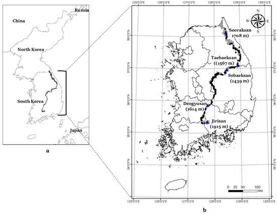 Key map and study sites. (a) The key map shows South Korea and the Baekdudaegan reserve area. (b) The location of the survey sites (a total of 341 plots) in Baekdudaegan, from Hyangrobong to Cheonwangbong.