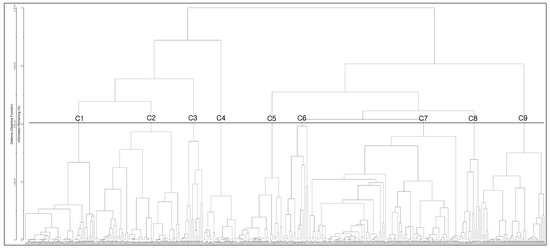 Based on cluster analysis and the vegetation data collected from 341 P. densiflora communities in Baekdudaegan, the selected study sites were classified into 2–10 clusters (Figure 2). The basis on which a suitable number of clusters was determined was the lowest mean p-value of the indicator value, the highest number of species that satisfy the significance level, or both [42]. In this study, the number of communities that resulted in the lowest mean p-value (0.418) was 9, whereas the number of indicator species satisfying the significance level (p < 0.05) was 61; hence, the Baekdudaegan P. densiflora communities were classified into nine community types (Figure 3).