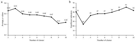 Indicator species analysis from steps 2 to 10 during the clustering process. (a) Change in p value after 4999 permutations of the 406 species. (b) Number of species with p < 0.05.