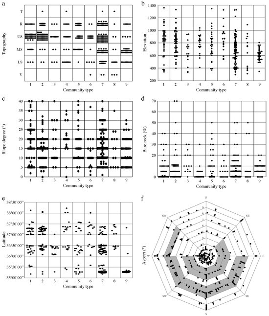 Relationship between community type and environmental factors: (a) topography; (b) elevation; (c) slope degree; (d) bare rock; (e) latitude; (f) aspect.