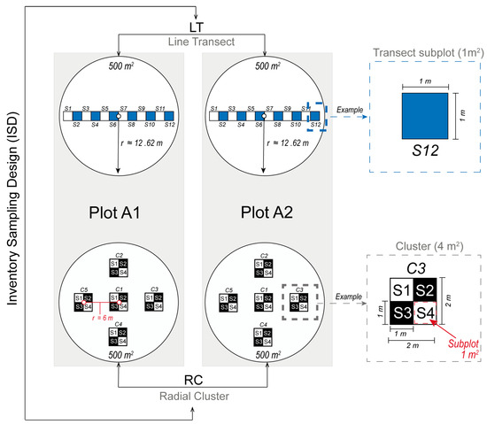 Two circular plots (A1 and A2; Figure 1), each with an area of 500 m2 (radius = 12.62 m), were established in the pilot forest to monitor the dynamics of cork oak regeneration. Plots A1 and A2 are located at 41.352589° N, 6.794488° W (570 m a.s.l.) and 41.352578° N, 6.792151° W (579 m a.s.l.), respectively. The evaluations were carried out on sampling plot within A1 and A2 using two inventory sampling designs (ISD), the line transect (LT) and the two-stage radial cluster (RC), as shown in Figure 1. The LT design has 12 square subplots, resulting in a total of 24 subplots when considering both A1 and A2 plots. Each subplot covers an area of 1 m2 (1 m × 1 m), organized consecutively in a rectangle configuration spanning 12 m in length and 1 m in width. The center of LT is located at the midpoint of each plot (Figure 1). In contrast, the RC design comprises five clusters of subplots, each encompassing a square area of 4 m2. Each cluster comprises four square subplots of 1 m2 (1 m × 1 m), yielding a total of 20 subplots (4 subplots × 5 clusters) per plot, and an aggregate of 40 subplots for plots A1 and A2 combined. One cluster is situated at the center of the plot, and the other four clusters are arranged radially, equidistantly positioned from the center (6 m), the plot boundary, and from one another (Figure 1).
