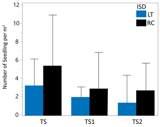The mixed model analysis indicated a significant effect of ISD on TS1 and TS2. The mean density of total living seedlings (TS) was 3.22 per square meter for LT and 5.45 for RC (Table 1 and Figure 2). Using RC as the reference (100%), the mean value of LT represented 59.08% of RC, indicating a 40.92% reduction in TS mean density estimates for LT. When analyzing the TS subgroups separately, similar patterns are evidenced. TS1 (seedlings ≤10 cm in height) displayed mean values of 1.95 units for LT and 2.84 for RC, representing a 31.34% reduction in TS1 density estimates from LT assessments. Similarly, TS2 (seedlings > 10 cm in height) displayed mean values of 1.27 units for LT and 2.61 for RC, indicating a 51.34% reduction in TS2 estimates for LT.