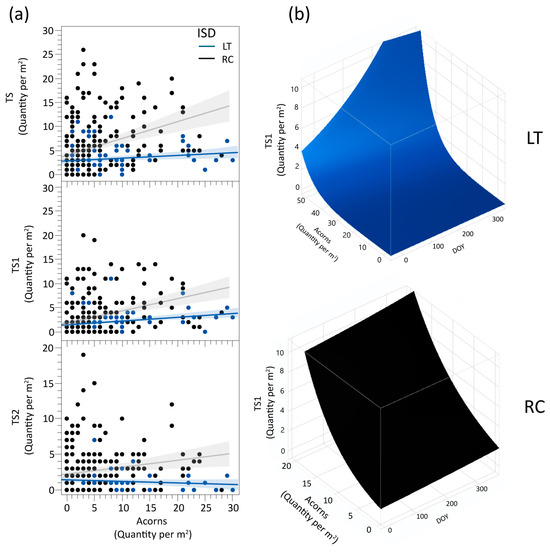 (a) Denotes the relationship between each ISD (LT and RC) for the live seedlings (TS; TS1; TS2) and the number of acorns per square meter. (b) The relationship of TS1 with interaction ISD × Acorns × DOY is shown by two 3D graphs, LT (in blue) and RC (in black). Note. The Acorns density scale is different because the increased intensity of TS1 density was more pronounced in RC than in LT.