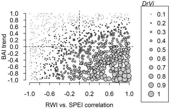 Proposed framework to study drought-induced vulnerability. The product of the standardized growth trajectory (basal area increment, BAI trend) and growth response to the drought index (RWI vs. SPEI correlation) has a maximum value of 1 when the drought-induced vulnerability (DrVi) of the studied population is maximum. Grey points represent 999 random values of BAI trends and RWI vs. SPEI correlations with their size proportional to the DrVi value.