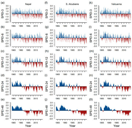 The Standardized Precipitation Evapotranspiration Index (SPEI; [59]) for the studied sites. The SPEI was calculated at scales of 3, 6, 12, 24, and 48 months for the period 1962–2023 in the studied sites: Napal (plots a–e), Sierra de Alcubierre (plots f–j), and Valcuerna (plots k–o). Blue colors indicate positive SPEI values (wet conditions) and brown colors indicate negative SPEI values (dry conditions). The index was calculated using the SPEI package in R [61] and the Terraclimate dataset [60].