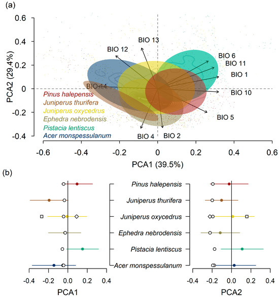 We found differences in the bioclimatic niche between the species studied (Figure 4a), which were significant according to PERMANOVA (F = 303, df = 7815; R2 = 0.16; p < 0.001). PCA1 was mainly related to temperature-related bioclimatic variables such as mean annual temperature (BIO 1), mean temperature of the wettest and driest quarter (BIO 10, 11), and maximum temperature of the warmest and coldest months (BIO 5, 6). Species like P. lentiscus and P. halepensis tended to have positive PCA1 values while A. monspessulanum and J. thurifera presented negative values. PCA2 separated sites with elevated temperature range and seasonality (BIO 2, 4) from sites with high precipitation (BIO 12, 13). Species like E. nebrodensis and J. thurifera had lower PCA2 scores than species like A. monspessulanum and P. lentiscus (Figure 4a).