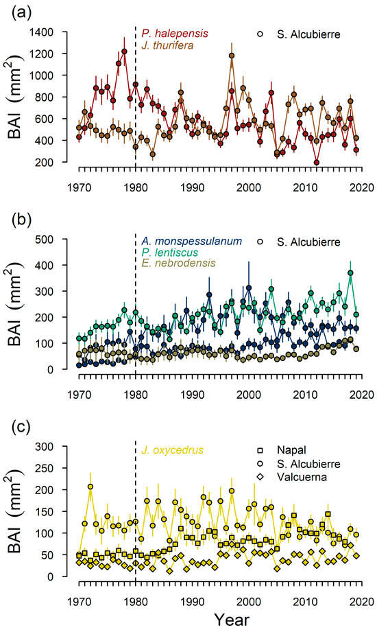 The basal area increments (BAI) of Pinus halepensis Mill. and Juniperus thurifera L. (a); Acer monspessulanum L., Pistacia lentiscus L. and Ephedra nebrodensis Tineo ex Guss. (b) in Sierra de Alcubierre; and Juniperus oxycedrus L. across all study populations (c). The vertical dashed lines indicate the year 1980, which coincides with a climatic shift (see Figure 2). Values are means ± SD.