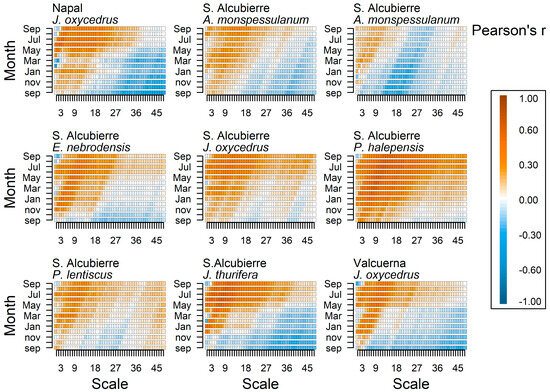 To study the relationship between growth variability and drought severity (SPEI), we calculated Pearson correlation coefficients between the residual site chronologies of each species and the SPEI. Correlations were obtained for each month of the year, from September of the previous year of growth (t − 1) to September of the current year (t). The significance associated with the correlation coefficients (p < 0.05) was calculated using a permutation test. In our case, we used 1000 permutations to establish the significance of each correlation coefficient. Analyses were performed at scales from 1 to 48 months during the period 1962–2020 using 25-year moving windows. Thus, we studied how the RWI vs. SPEI correlations varied in time (25-year moving window) within the study period (1962–2020). For each moving window, we selected the maximum correlation between the growth variability and the SPEI drought index. These calculations were done using the treeclim package in R [64].