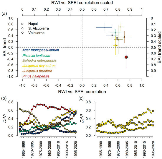 The variations in growth trajectory, growth–drought coupling, and the vulnerability index between populations and species. In (a), each population is represented according to the average BAI trend and maximum RWI–SPEI correlation in the period 1962–2020. Dots represent averages, with the size proportional to the drought-induced vulnerability index. The segments represent the standard deviations for the means in the BAI trend and RWI–SPEI correlation. In (b), the temporal variation in DrVi value is shown considering 25-year moving windows for the period 1962–2020 in Sierra de Alcubierre. In (c), the temporal variation in DrVi value is presented for the period 1965–2020 and the J. oxycedrus populations studied in Napal, Sierra de Alcubierre, and Valcuerna. Each species and population are represented with a different color and symbol, respectively.