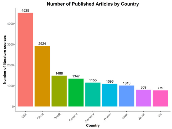 Tree phenology, the study of recurring biological events in trees, plays a critical role in ecosystem functioning [11,12]. Phenological events, such as bud burst, leaf expansion, flowering, and leaf senescence, are highly sensitive to environmental changes [13,14]. These events regulate key ecological processes, including photosynthesis, carbon sequestration, and species interactions [15]. For example, the timing of flowering can affect pollinator availability [16], whereas leaf senescence influences nutrient cycling and soil organic matter decomposition [17]. Investigating tree phenology is crucial for understanding tree fitness, competition for resources, and the impacts of climate change on ecosystems [12,18]. Our analysis revealed that over 80% of tree phenology studies originate from just nine countries (Figure 1). The United States and China are the most prominent, accounting for 24.51% and 15.84% of the studies, respectively. Other significant contributors include Brazil, Canada, France, Spain, Japan, and the United Kingdom, whose respective shares range from 4.22% to 8.06%. This distribution underscores a notable research imbalance, with many regions remaining underrepresented. Factors such as limited research capacity and funding constraints may contribute to this disparity. Future research efforts should prioritize the exploration of underrepresented areas to achieve a more comprehensive understanding of global tree phenology.