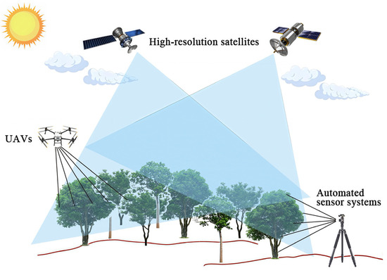 The Sentinel-2 and Landsat series of high-resolution satellites have significantly enhanced the spatial and temporal resolution of phenological monitoring [48,49]. These satellites provide frequent, detailed data that improve the accuracy of tree-crown-scale leaf phenology monitoring [50]. Additionally, unmanned aerial vehicles (UAVs) equipped with multispectral sensors offer unprecedented spatial resolution, capturing fine-scale phenological changes at the tree-crown level [51]. These advancements overcome the limitations of traditional remote sensing, such as coarse spatial resolution and infrequent data acquisition [34]. However, when dealing with UAVs, it is crucial to address the issues of revisit frequency and coverage capacity. Acquiring large surfaces with high revisit frequencies remains a challenge because of the limited flight time and range of UAVs. Moreover, there are limitations in using UAVs for phenology monitoring, including regulatory restrictions, data processing complexity, and the need for skilled operators. In combination with these technologies, automated sensor systems—including sap flow monitors and microcore samplers—provide continuous, high-resolution data on tree physiological processes [52]. For example, sap flow sensors elucidate the relationship between phenological events and water use dynamics [53], whereas microcore sampling tracks cambial activity and growth patterns [54]. Together, these tools enable a more comprehensive understanding of phenological dynamics across scales (Figure 2).