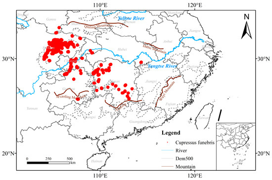 The basic map boundary data of China used in this study were obtained from the Data Center for Resources and Environmental Sciences, Chinese Academy of Sciences (https://www.resdc.cn, accessed on 20 April 2024). The distribution data of Cupressus funebris were sourced from the “Vegetation Atlas of China” (1:1,000,000). Through the spatial alignment, vector digitization, and rasterization processing in ArcGIS 10.8 software, 4683 distribution sample points of Cupressus funebris with a resolution of 1 km were generated. In order to ensure that each research unit contains only one point data and avoid the influence of duplicate points on the research results, the ArcGIS buffer analysis method was used, with a buffer radius set at 5 km. Finally, 397 sample points were screened and retained, and the longitude and latitude coordinate data of the sample points were extracted and exported in CSV format for model operation (Figure 1).