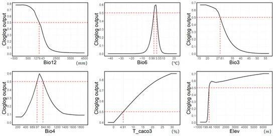 Among the six main driving variables influencing the community distribution, the suitable ranges of environmental variables for the growth of Cupressus funebris are as follows: the annual precipitation (Bio12) should be ≤1279 mm; the suitable range of the minimum temperature of the coldest month (Bio6) is 0.99–3.53 °C, the suitable range of isothermality (Bio3) is 15–27.6; the suitable range of the temperature seasonality index (Bio4) is 690–841; Cupressus funebris can survive when the soil carbonate content (T_caco3) ≥ 4.91%; and it is most suitable for Cupressus funebris to survive when the altitude (Elev) ≥ 200 m (Figure 3).