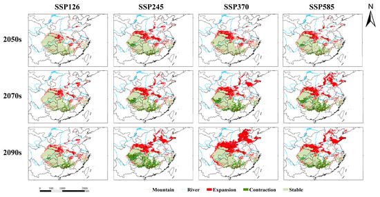 The expansion areas are located to the northeast of the current distribution areas. Under the SSP126 low-carbon emission scenario, the distribution is relatively stable. As carbon emissions increase, the area of the expansion areas continues to grow, gradually crossing mountain ranges, such as the Qinling Mountains and the Dabie Mountains. The distribution in northern provinces, such as Shandong, Hebei, and Beijing, increases, and the expansion areas reach their maximum in the SSP370 scenario by 2090. The increase in carbon emissions leads to a continuous increase in the area of the contraction areas located at the junction of Sichuan and Guizhou, around the Nanling Mountains, and in the coastal areas of Zhejiang. The stable areas are mainly in the four provinces of Sichuan, Chongqing, Guizhou, and Hunan, and the stable areas continue to shrink as carbon emissions intensify (Figure 4).