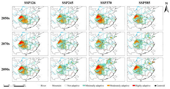 The areas of highly, moderately, and minimally adaptive areas for Cupressus funebris have changed significantly (Figure 5). In the 2050s, as carbon emissions increase, the total area of adaptive areas first increases and then decreases, with the growth rate ranging from 6.66% to 12.99%. The area of highly adaptive areas shrinks by 11.40%–86.01% compared with the current situation. The reduction in the area of highly adaptive areas is the most significant under the SSP245 scenario. In the 2070s, the total area of adaptive areas under different scenarios changes slightly. The highly adaptive areas shrink by 29.50%–90.75% compared with the current situation. The shrinkage of highly adaptive areas is relatively small under the SSP126 scenario, and the area of highly adaptive areas shrinks sharply as carbon emissions increase. In the 2090s, the total area of adaptive areas increases by 1.89%–72.39%. Under the SSP370 scenario, both the total adaptive areas and highly adaptive areas reach their maximum, increasing by 72.39% and 3.18%, respectively, compared with the current situation, and the areas of highly adaptive areas and total adaptive areas reach their peaks. However, under the SSP245 scenario, the highly adaptive areas shrink most severely, with an area reduction of 95.71% (Figure 6).