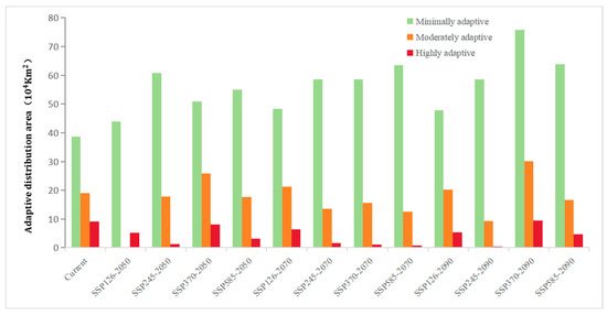 The result files of the MaxEnt model were imported into ArcGIS software. Combining with the reclassification tool in the spatial analysis tool, we divided the adaptive distribution into four grades according to the survival suitability: not adaptive distribution (0–0.06), minimally adaptive distribution (0.06–0.22), moderately adaptive distribution (0.22–0.43), and highly adaptive distribution (0.43–1.0), and visualized them. The grid calculator in ArcGIS was used to calculate the number of grids of each type and the areas of adaptive distribution at different grades under different environmental conditions.