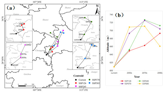 Global warming has caused centroid migration and altitude change in Cupressus funebris forests. Currently, the distribution centroid of Cupressus funebris is located in Chongqing City. Under different carbon emission scenarios, the centroid shows a trend of migrating towards the northeast region. Under the SSP126 scenario, the centroid moves into the territory of Enshi City, Hubei Province, and the moving distance gradually shortens. Under the SSP245 scenario, in the 2050s, the centroid moves 180.9 km to Enshi City, Hubei Province; in the 2070s, it moves 59.3 km to the border between Chongqing and Hubei; in the 2090s, it moves 167.58 km to Shiyan City, Hubei Province. The moving distance first shortens and then increases, with relatively significant changes. Under the SSP370 scenario, the centroid gradually moves towards the northeast. In the 2050s, the centroid moves 84.24 km to Enshi City, Hubei Province; in the 2070s, it moves 194.6 km to Shiyan City, Hubei Province. However, in the 2090s, it moves 96.4 km to the northwest and reaches Ankang City, Shaanxi Province. Under the SSP585 scenario, in the 2050s, the centroid moves 154.53 km to the border between Chongqing and Hunan; in the 2070s, it moves 202.63 km to Shiyan City, Hubei Province; in the 2090s, the centroid remains within Shiyan City, with a relatively small moving distance. As time passes, the adaptive distribution center of Cupressus funebris migrates towards the northeast, and under the low-emission scenarios, the moving distance of the centroid is relatively small (Figure 7a).