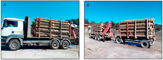The truck under test was a MAN TGS 33.480 type 6X4 (MAN Truck&Bus SE, Munich, Germany) specialized in assortment transport (Figure 2A,B). It was equipped with a Palfinger hydraulic crane, model Epsilon M120Z82, with a reach of 8.80 m (Epsilon Kran GmbH, Elsbethen-Glasenbach, Austria), and a Schwarzmüller 2-axle timber/stall trailer without box (Schwarzmüller, Freinberg, Austria) (Figure 2). In the study area, access for the truck and trailer was not possible due to the nature of the forest roads (rugged terrain and frequent curves). The solution that was implemented was to leave the trailer on the public road and enter the forest only with the truck and use the crane mounted on it to collect the timber. The technical data of the truck and trailer are given in Table 2. The load was limited by the maximal permissible mass of the truck with trailer in Bulgaria (40 tons) according to Bulgarian legislation [37], according to the Regulation of the European Council no. 2015/719 from 25 April 2015 [38], which amended the Regulation of the European Council no. 96/53 ES from 25 July 1996. Therefore, the permitted payload of the truck with the trailer is 21.7 tons or expressed in cubic meters of coniferous timber (27.12 m3).