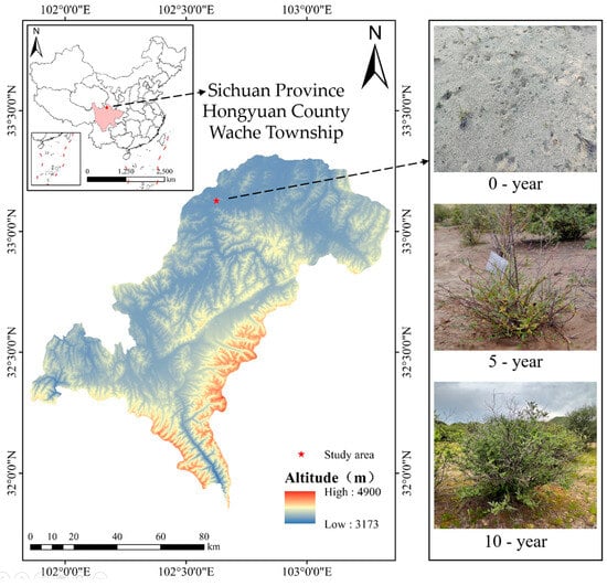 The research was conducted in Wache Township (31°51′–33°19′ N, 101°51′–103°23′ E), which is situated within Hongyuan County of Sichuan Province’s Aba Tibetan and Qiang Autonomous Prefecture (Figure 1). The terrain slopes from southeast to northwest, with an average elevation of over 3400 m. The climate belongs to the continental plateau cold temperate monsoon climate, with a short spring and autumn, long winter, and no summer. The average annual rainfall is 791.95 mm, with approximately 60%–75% occurring from May to September. The average annual temperature is 1.1 °C, with the coldest and warmest monthly averages of −10.3 °C and 10.9 °C, respectively. The average annual sunshine duration is 2158.7 h, and the annual total solar radiation is 6194 MJ m−2. The soil is classified as a Cambic Arenosol, which is sandy in texture, loose in structure, and low in nutrients [25]. Due to the long-term impact of human factors such as population increase and overgrazing as well as the impact of natural factors such as global warming and damage by rats and insects, the alpine grassland in northwest Sichuan has been severely degraded, and desertification has occurred in some areas. Since the 1980s, the main methods of restoring sandy grassland in this area have been voluntary tree-planting activities, the installation of sand barriers, and the planting of Salix cupularis. Salix cupularis is generally planted in May when the rainy season comes, with an interval of 1–2 m. After plants were successfully established, the sandy land was left alone to restore naturally, without human management or disturbance [22,23,24].