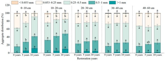Composition of soil aggregates at depths of 0–60 cm in different restoration years. Different lowercase letters indicate significant differences among different years of the same soil layer (p < 0.05).
