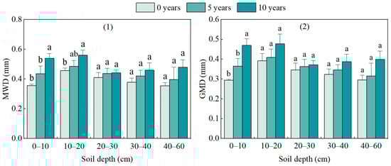 The MWD (1) and GMD (2) of the aggregates at different restoration years. Different lowercase letters indicate significant differences among different years of the same soil layer (p < 0.05).