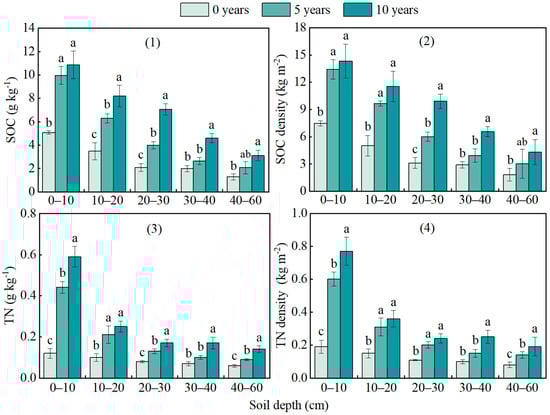 The content and density of SOC (1), SOC density (2), TN content (3), and TN density (4), at different restoration years. Different lowercase letters indicate significant differences among different years of the same soil layer (p < 0.05).