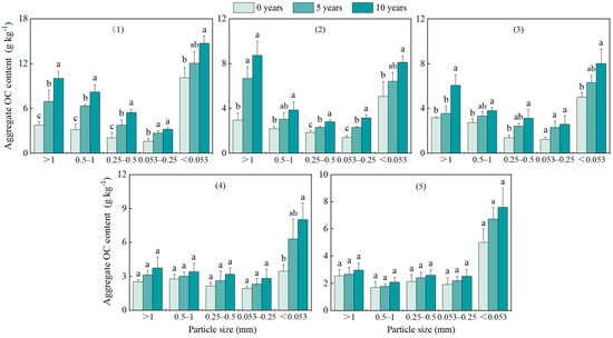 Organic carbon content of the aggregates for 0–10 cm (1), 10–20 cm (2), 20–30 cm (3), 30–40 cm (4), and 40–60 cm (5) at different restoration years. Different lowercase letters indicate significant differences among different years of the same soil layer (p < 0.05).