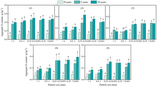 Nitrogen content of the aggregates for 0–10 cm (1), 10–20 cm (2), 20–30 cm (3), 30–40 cm (4), and 40–60 cm (5) at different restoration years. Different lowercase letters indicate significant differences among different years of the same soil layer (p < 0.05).
