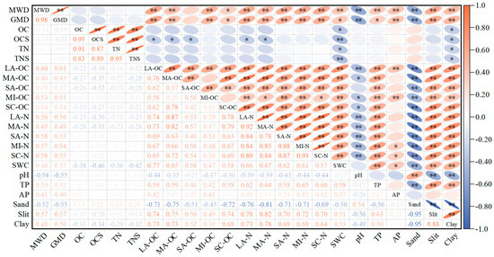Correlation analysis. MWD—mean weight diameter; GMD—geometric mean diameter; OC—soil organic carbon; OCS—soil organic carbon density; TN—total nitrogen; TNS—total nitrogen density; LA—large aggregate (>1 mm); MA—medium aggregate (0.5–1 mm); SA—small aggregate (0.25–0.5 mm); MI—microaggregate (0.053–0.25 mm); SC—silt + clay (<0.053 mm); SWC—soil water content; TP—total phosphorus; AP—available phosphorus. The values in the table are the Pearson correlation coefficients; * indicates significant correlation at the 5% level; ** indicates significant correlation at the 1% level.