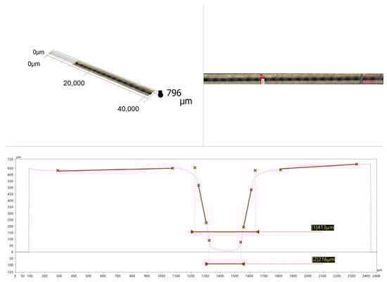Methodology for measuring the kerf width on the upper and lower sides of the sample (combination of parameters: 75% laser power, 15 mm·s−1, and lens magnification: ×200); axes: y = profile length, x = profile height.