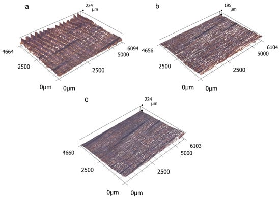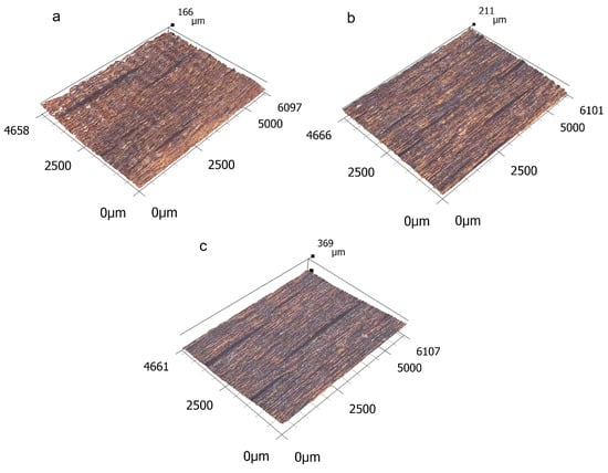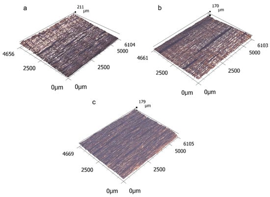 The first step was to perform a microscopic analysis using the Keyence VHX-7000 digital microscope (Keyence Corporation, Osaka, Japan). From Figure 2, Figure 3 and Figure 4, it is possible to see a greater burning of the wood surface, especially at lower feed speeds (Figure 2c, Figure 3c and Figure 4c), which is in line with other works []. This was probably due to the higher dose of radiation. The heat-affected zone was created by the pyrolysis of chemical components in wood, especially lignin and cellulose. The laser beam often leaves a solidified burn on the surface. Figure 2, Figure 3 and Figure 4 further show that fundamental surface unevenness is created mainly by increasing the feed speed. By increasing it, waves (or even stripes) appear on the surface after the laser beam has passed (Figure 2a, Figure 3a and Figure 4a). At high speeds, it does not burn the material enough due to the lower dose of radiation. A possible explanation for the formation of these regular waves may also be the vibrations of the laser head. In [], these waves should gradually disappear with increasing the feed speed, but in the case of this experiment, they were the largest at the lowest laser power and the highest feed speed. The stripes were on the burnt surface at a certain inclination, which is caused by the action of the gas stream and the removal of some of the energy from the laser beam. From Figure 2, Figure 3 and Figure 4, it can be observed that, with a low laser power (and therefore a low dose of energy) and a high feed speed, this inclination is the greatest (Figure 2a). The explanation may be the greater action of the gas flow at a low energy. With the higher laser power, this slope was almost eliminated, which may have been due to a sufficient dose of energy to cut through the wood (Figure 3a and Figure 4a).