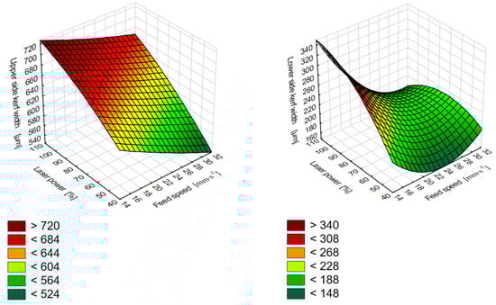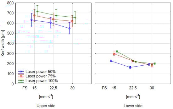 After analysing the data from ANOVA, polynomial regression models of the second degree were created from the measured data for the upper and lower sides of the cutting kerf. Both models are statistically significant (p = 0.000) at the significance level of α = 5%. The model describes the development of the kerf width on the upper side with an accuracy of 98.01% and on the lower side with an accuracy of 95.95%. In both cases, it was proven that the development of the kerf width is most affected by the feed speed. The theory in this case is confirmed by the magnitude of the regression coefficients for the feed speed in Equations (1) and (2). At the same time, the equations show an inverse proportionality between the kerf width and the feed speed and a direct proportionality between the kerf width and the laser power. Figure 8 shows that the development of the kerf width at the same CO2 laser parameters is different on the upper side and lower side of the sample. While on the upper side, the growth of the kerf width is close to linear growth, on the lower side, the absorption of radiation has caused a significant reduction in the kerf width. By comparison of both graphs in Figure 8, it can be argued that the lower dose of energy was delivered, especially when combining higher laser power and high feed speed. In both cases, the largest kerf width was measured at a low feed speed and the highest laser power, which also corresponds to the highest energy delivered per unit area (9 J·mm−1). This is consistent with the theory [,,]. The lowest kerf width was measured at the lowest laser power and the highest feed speed, which also corresponds to the lowest amount of energy delivered per 1 mm of the kerf length (2.25 J·mm−1).
