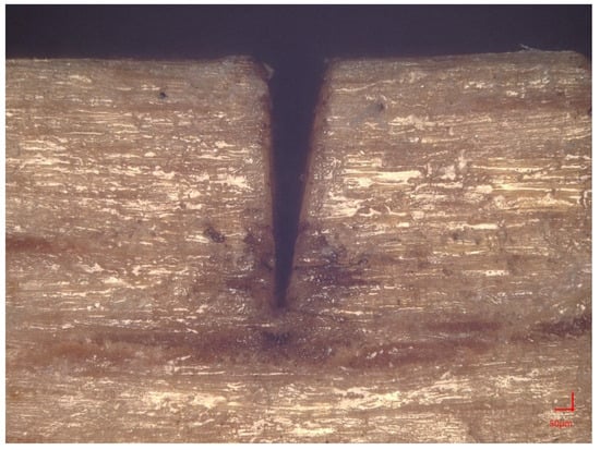 Conical V-shape of the kerf when the material is incompletely cut (combination of parameters: 75% laser power, 15 mm·s−1, and lens magnification: ×200).