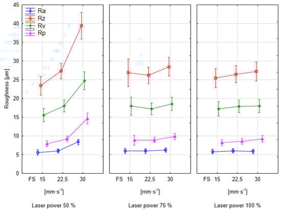 With the change in laser power, there were statistically significant changes in R-parameters, but their development varied (Figure 7). Increasing the feed speed generally leads to higher surface roughness values (Ra, Rz, Rp) across all laser power levels. The lowest laser power (50%) resulted in the most significant increase in surface roughness with an increasing feed speed. Higher laser powers (75% and 100%) provided more stable surface roughness characteristics across the tested range of feed speeds, with less sensitivity to changes in the feed speed. The trend for the Rv parameter is less consistent across the different power levels and feed speeds compared to the other roughness parameters. According to Figure 7, the feed speed plays a crucial role in determining the surface finish during the CO2 laser processing. At the lowest power setting, the increase in Ra, Rz, and Rp with feed speed appears to be the most significant. Rv shows a notable increase from 15 to 30 mm·s−1. At the 75% laser power, the increase in Ra, Rz, and Rp with feed speed is less pronounced compared to the 50% laser power. Rv shows a slight increase from 15 to 22.5 mm·s−1. At the highest laser power setting, the trends for Ra, Rz, and Rp show the least sensitivity to changes in the feed speed within the tested range. The values remain relatively stable as the feed speed increases.
