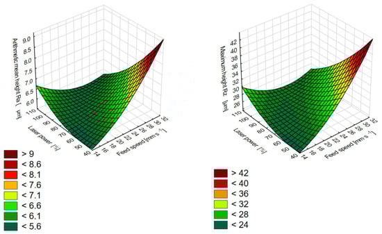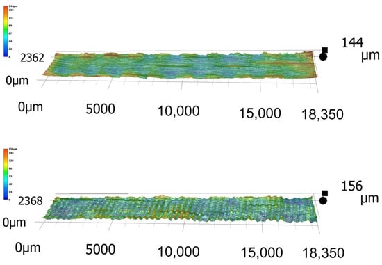 Figure 10 shows the height map of surfaces cut with a CO2 laser at the most optimal and least optimal values of laser power and feed speed according to the created polynomial regression models. As follows from the regression model as well as from the microscopic analysis, at the least optimal values, the laser beam created significant waves on the surface over the entire cut area. With the decrease in this feed speed, the extent of wave formation also decreased, but these were not completely removed. At the same time, by optimising the technological parameters of the CO2 laser, the number of cracks on the surface decreased. Figure 10 shows that the red zone in the graph of the regression model (Figure 9) is characterised by waves on the surface and a significantly uneven surface. The dark-green zone is a less-burnt surface, without waves after the laser beam has passed, and without microcracks that have disturbed the surface.