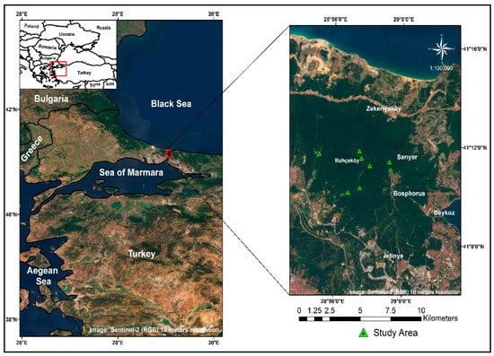 The Belgrad Forest in Istanbul was chosen as the study area because of its distinctive location (Figure 1), its accessibility to a wide variety of visitors, and its prominence as a destination for both local residents and international tourists. The spatial boundaries and location of the Belgrad Forest were visualized using Google Earth Pro (version 7.3.6 Google LLC, Mountain View, CA, USA), as presented in Figure 1.