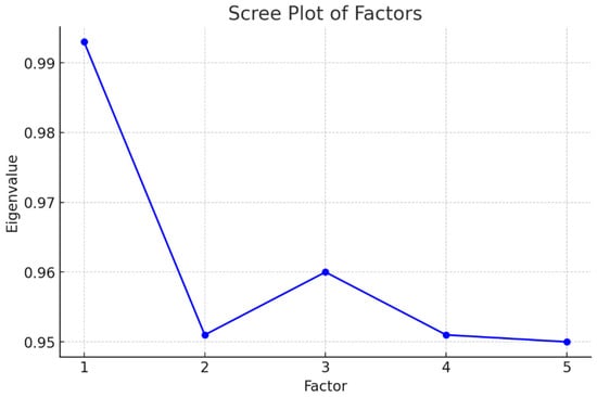 An exploratory factor analysis (EFA) was conducted to identify latent dimensions underlying participants’ emotional responses and environmental attitudes related to urban green space use. A total of 30 variables were included in the analysis, drawn from survey items designed to assess the psychological impacts of green space exposure and environmental values. The number of factors to retain was determined through the eigenvalue >1 rule and visual inspection of the Scree plot. As shown in Figure 2, a clear inflection point after the fifth component supported the selection of a five-factor solution.