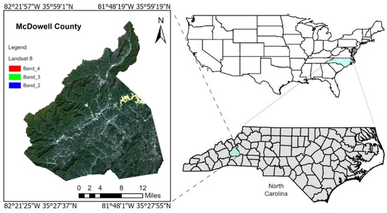 The study area covers McDowell County, located within the southern Appalachian Mountains region in the western part of North Carolina, USA (Figure 1). Forests in this county cover roughly 75% of the total area, which is 445 square miles []. A set of two Landsat Operational Land Imager (OLI) images (path 18, row 35) was collected. The first was taken on 30 August 2024, before Hurricane Helene’s landfall, and the second on 17 October 2024, with cloud cover of less than 10%; the projection coordinate system was Universal Transverse Mercator (UTM); the geographic coordinate system was WGS84. The full-scene Landsat 8 image size is 7771 rows × 7901 columns. Because of the cloud-free conditions, we did not carry out any atmospheric correction of the image. We derived all the spectral indices from these images. It was presumed that throughout this brief timeframe, no more disruptions transpired in the study area aside from the damage caused by Hurricane Helene.