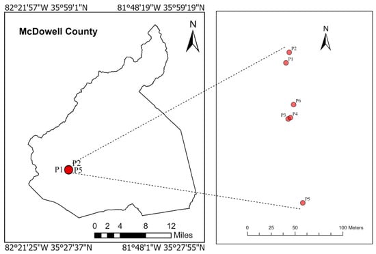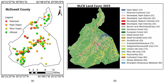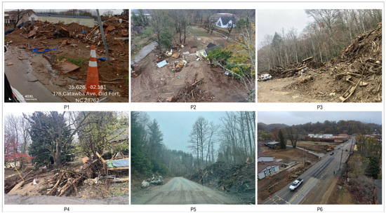 To facilitate the image processing and execute change detection techniques, three other geographically referenced datasets were collected: (1) GIS data layer from NHQRedCrossGIS [] and 2018 TIGER/Line shapefiles from the Environmental Systems Research Institute as shown in Figure 2a, and (2) training and validation samples were collected from National Land Cover Database (NLCD) class maps 2023 (All Annual NLCD Landcover 2023 with accuracy 80.4–90.6%) [] as shown in Figure 2b. (3) We conducted a field survey on 14 November 2024 to collect reference data samples using drone and mobile cameras. Figure 3 and Figure 4 show the location points and collected images, respectively. Images P2 and P6 in Figure 4 were captured by drone. We used the Skydio 2 drone (Skydio Inc., Redwood City, CA, USA) with a 12.3 MP 1/2.3″ CMOS sensor capable of shooting 4 K video at 60 fps and 12 MP still photos. Skydio 2 was selected due to its advanced AI-assisted flight technology, high-resolution imaging capabilities, and precise autonomous navigation, which collectively enhanced the quality, consistency, and reliability of aerial image collection. Its camera features a wide 126° field of view and advanced image stabilization, including electronic image stabilization (EIS). The field inventory images in McDowell County focused on damage in upland forest areas and river floodplains. Data processing and analysis were carried out in ArcGIS Pro version 3.3 from Environmental Systems Research Institute, Redlands, CA, USA.