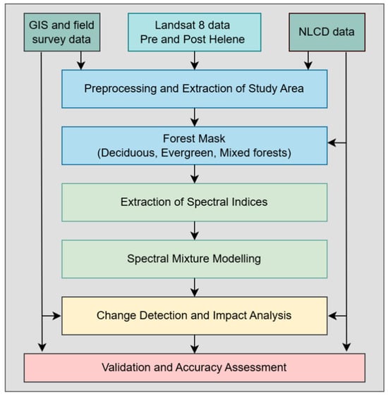 The occurrence of hurricanes in the southern U.S. is on the rise, and assessing the damage caused to forests is essential for implementing protective measures and comprehending recovery dynamics. This work aims to create a novel data integration framework that employs LANDSAT 8, drone-based images, and geographic information system data for change detection analysis for different forest types. We propose a method for change vector analysis based on a unique spectral mixture model utilizing composite spectral indices along with univariate difference imaging to create a change detection map illustrating disturbances in the areas of McDowell County in western North Carolina impacted by Hurricane Helene. The spectral indices included near-infrared-to-red ratios, a normalized difference vegetation index, Tasseled Cap indices, and a soil-adjusted vegetation index. In addition to the satellite imagery, the ground truth data of forest damage were also collected through the field investigation and interpretation of post-Helene drone images. Accuracy assessment was conducted with geographic information system (GIS) data and maps from the National Land Cover Database. Accuracy assessment was carried out using metrics such as overall accuracy, precision, recall, F score, Jaccard similarity, and kappa statistics. The proposed composite method performed well with overall accuracy and Jaccard similarity values of 73.80% and 0.6042, respectively. The results exhibit a reasonable correlation with GIS data and can be employed to assess damage severity.