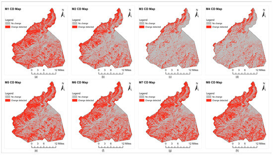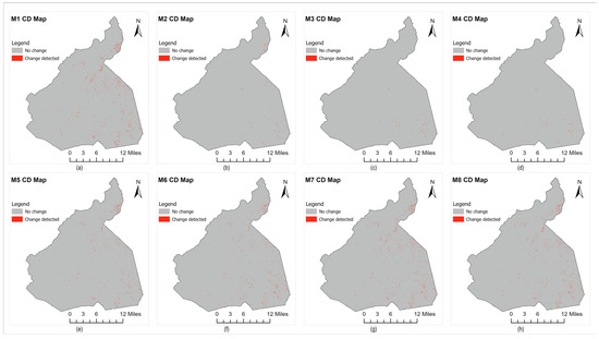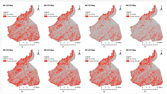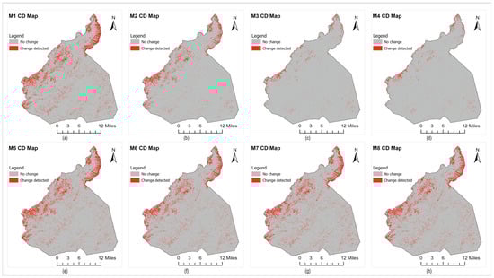 Change detection maps for evergreen forest (a–h) show maps generated by models M1–M8, respectively.