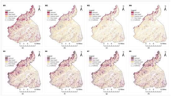 Further analysis is carried out in terms of area estimates for the damage severity maps. Figure 15a shows a total forest–affected area estimate comparison. Models M7 and M8 appear to detect more severe impacts compared to other models, with the largest areas of destroyed and major impact detected. M6 is particularly sensitive to moderate impact areas, detecting a large area (128.23 square miles), which suggests it excels at identifying areas with moderate damage. M2 seems to identify minor impact areas the most, detecting the largest area (206.74 square miles). The finding suggests that M2 may be more focused on identifying less severe damage and potentially has a lower sensitivity for more extreme impacts. M3 and M4 detect the largest areas of unaffected land, suggesting that these models may be more conservative or restrictive in identifying affected areas.