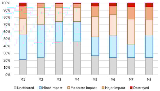 Figure 11 shows the contribution of different models in detecting damage levels. M8, M7, and M1 are the models that detect the most severe impacts, with M8 showing the highest detection in both the destroyed (4.81) and major impact (17.30) categories. These models seem to be the most sensitive to detecting significant damage in forest areas. Models M3 and M4 detect the most unaffected areas, suggesting they tend to be more focused on identifying regions that have not been impacted, while their detection of severe impacts is lower. M2 is more focused on minor impact areas and detects fewer severe impacts. It was observed that the model M8 performs better compared to other models. We conducted further analysis using the M8 model in terms of deciduous, evergreen, and mixed forest types.
